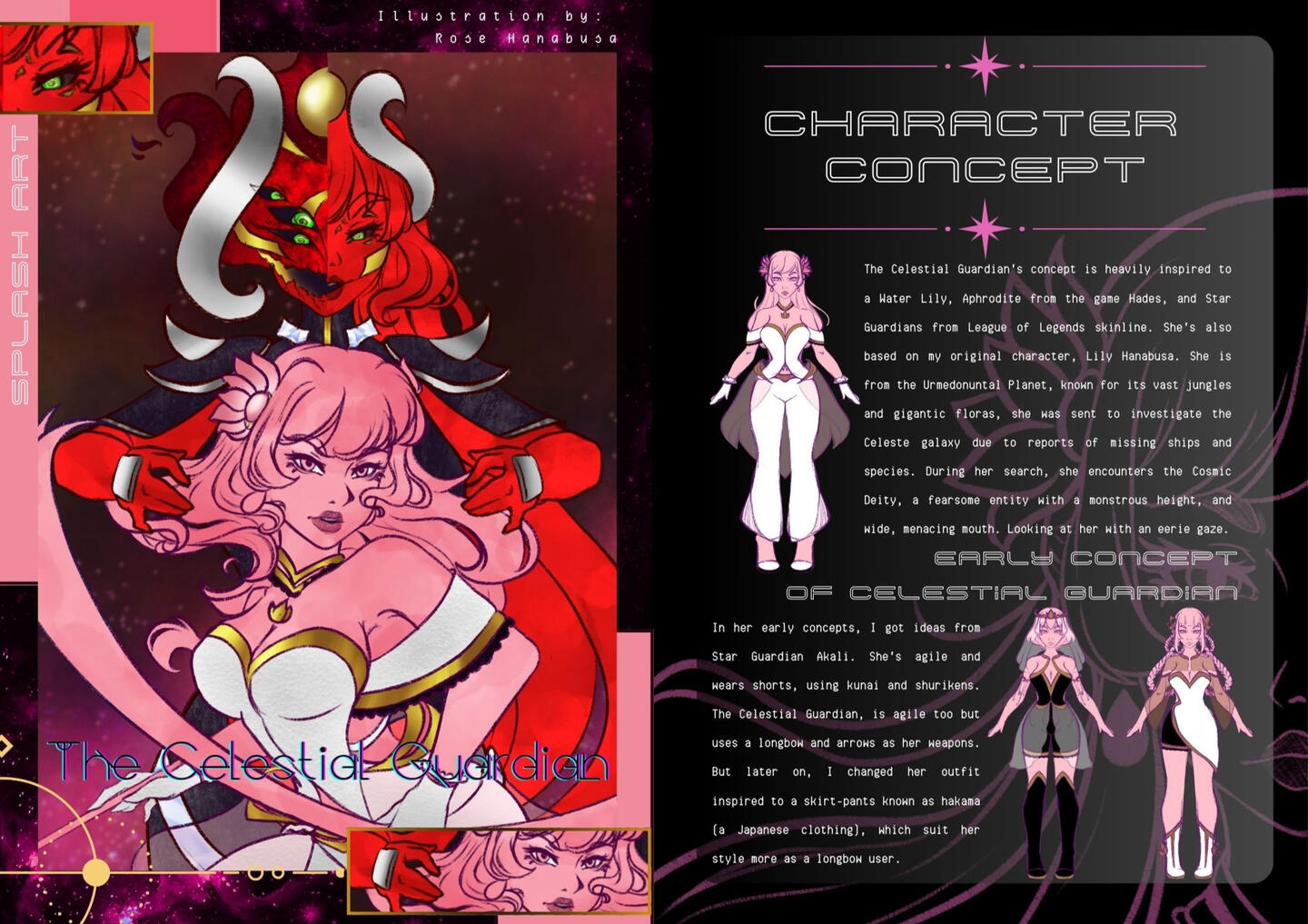 Hello, I am Rose Hanabusa. I am an illustrator and doing concept art. I specialize in creating original characters and splash arts to tell the characters stories.To guarantee the quality and details of my illustrations, I always take my time. I'm often looking for inspiration from anime, manga and video games. I'm always excited to start new projects and doing collaborations with my fellow artist friends and other people.